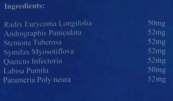 LISTE complete des ingredients pour 😎1 gélule vegetale BLUE de 360 mg : Extrait de Radix Eurycomia Longifiola 50 mg , Extrait de Andrographis Paniculata 52 mg , Extrait de Stemona Tuberosa 52 mg , Extrait de Smilax Myosotiflora 52 mg , Extrait de Quercus Infectoria 52 mg , extrait de Labisia Pumila 50 mg , Extrait de Para Mera Polyneura 52 mg .